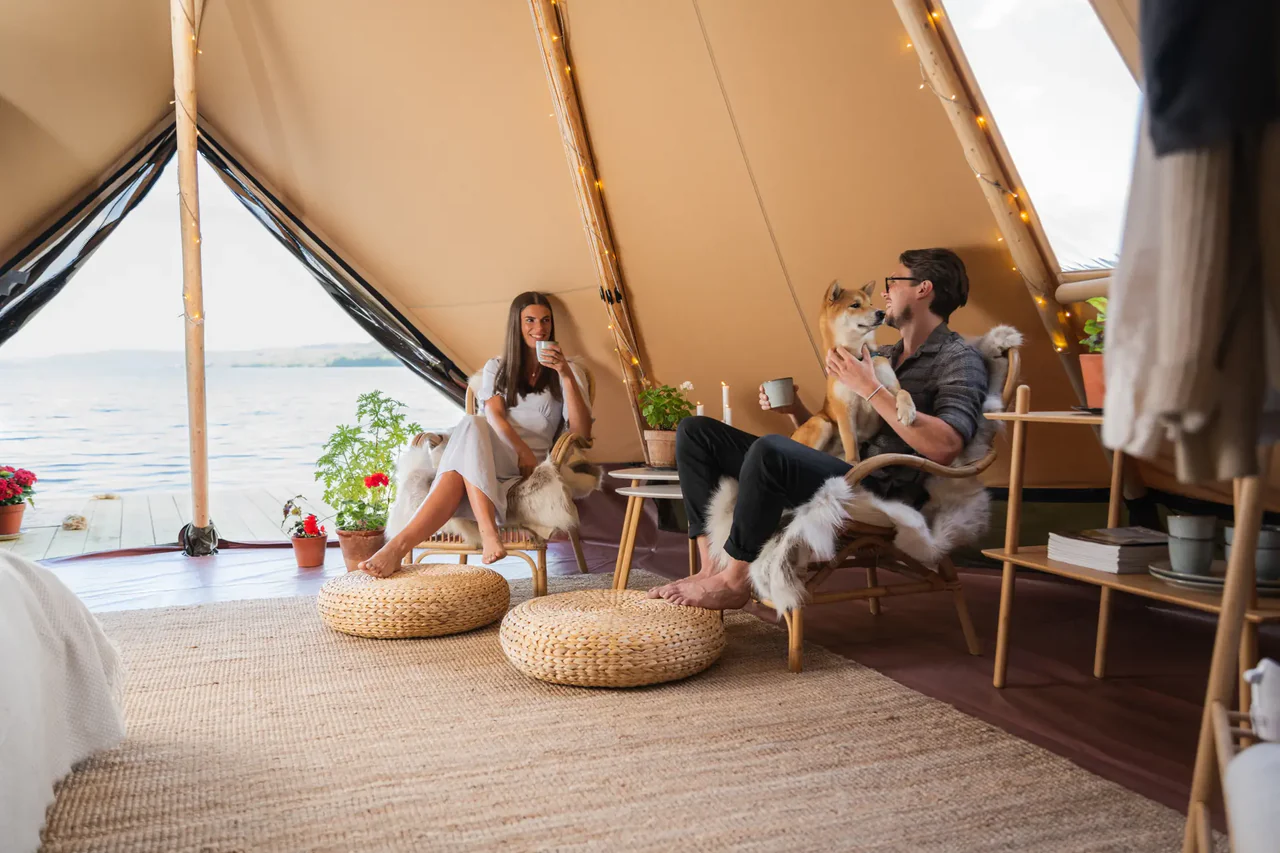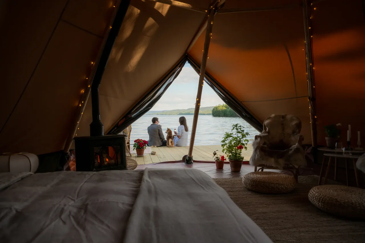 Aurum® er noget helt særligt. Glampingteltet skaber en atmosfære, der forener naturens skønhed med moderne luksus. Elegance gennemsyrer hver detalje, fra de to indgange, der byder dig velkommen, til de naturlige og bæredygtige materialer samt de strategisk placerede vinduer, der fylder teltet med lys og bringer dig tættere på naturen.